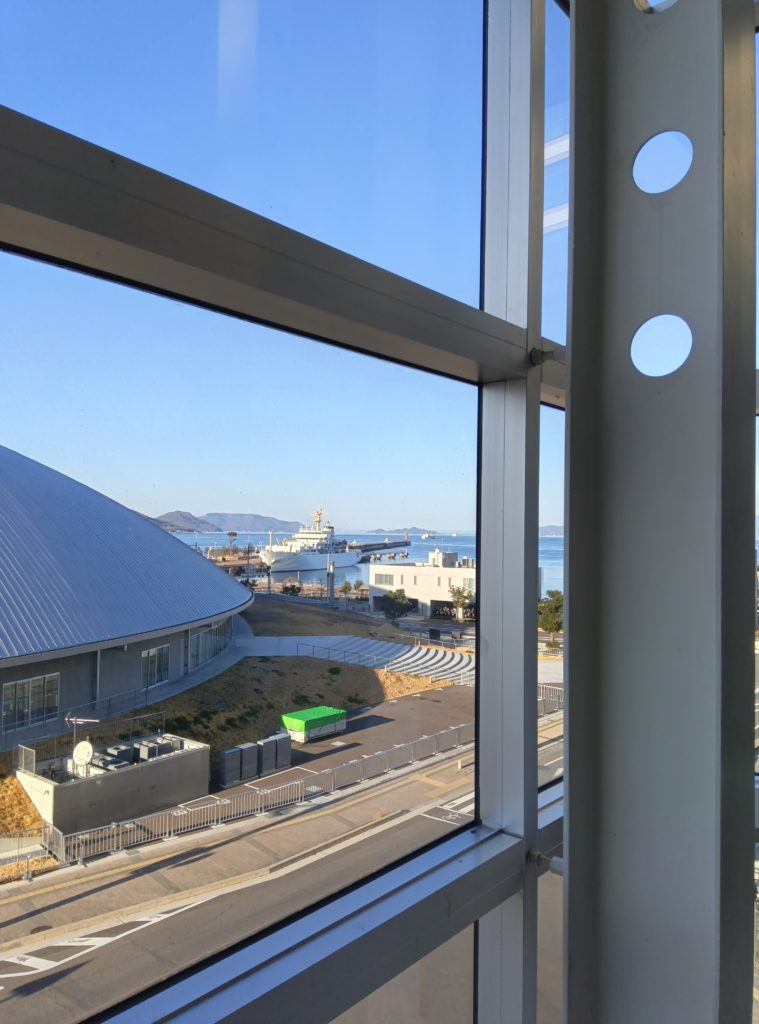 会場ロビーからの眺め。港が近く。女木島と直島も少し観光しました。